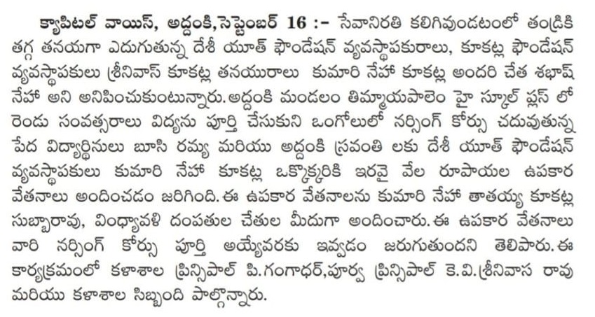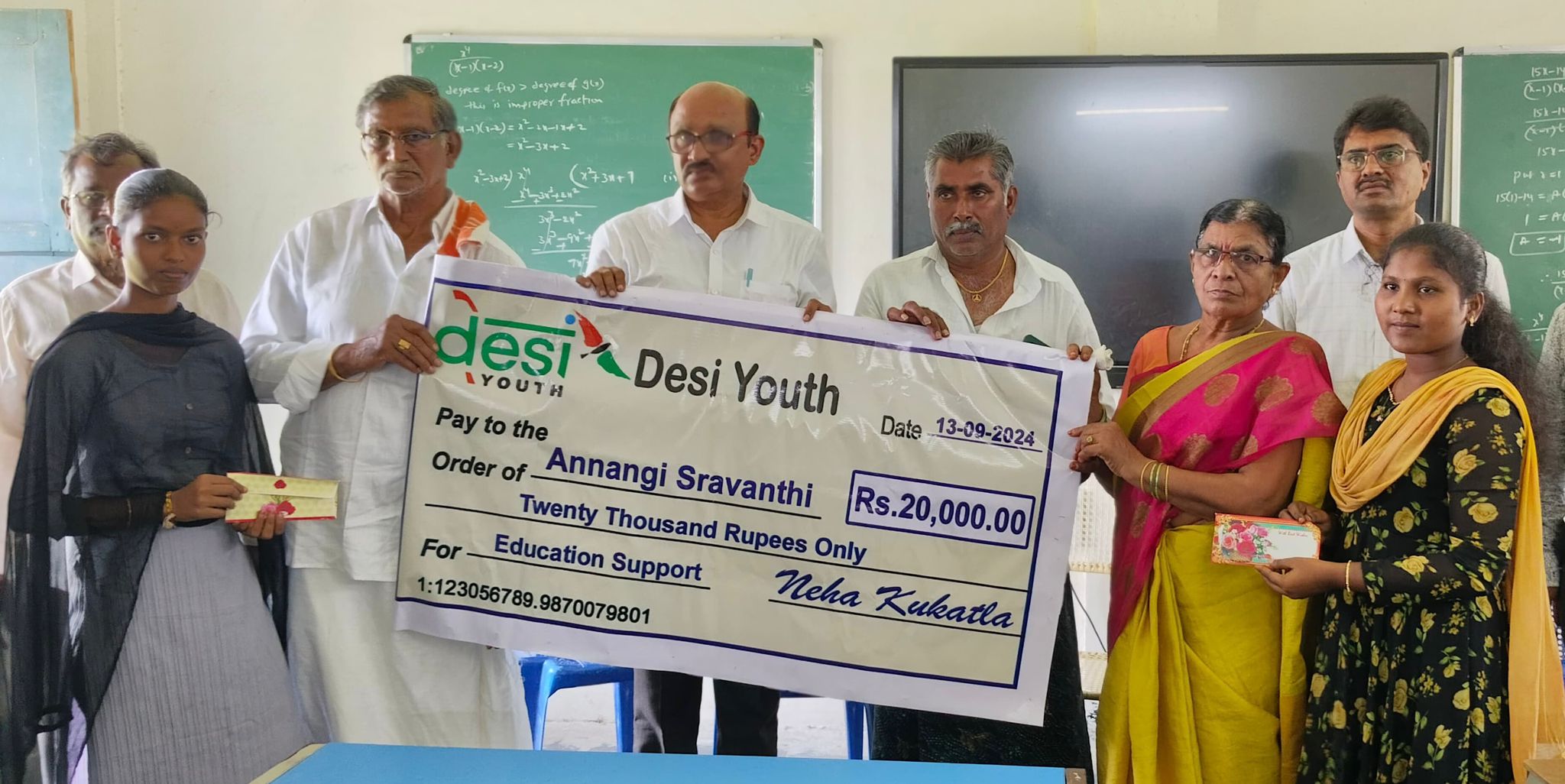 Desi Youth provided financial assistance of twenty thousand rupees each to two underprivileged nursing students, Busi Ramya and Addanki Sravanti. With the support of friends and members of Desi Youth, these funds are aimed at helping the students pursue their nursing studies at Bhargavi Nursing College in Ongole. Both students had completed their 12th grade at Timmayapalem High School in Addanki Mandal.